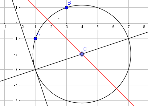 Bereken de straal van de grootste cirkel die door de punten met coordinaten (1,-1) en (3,1) gaat en die de rechte y=-3x raakt.